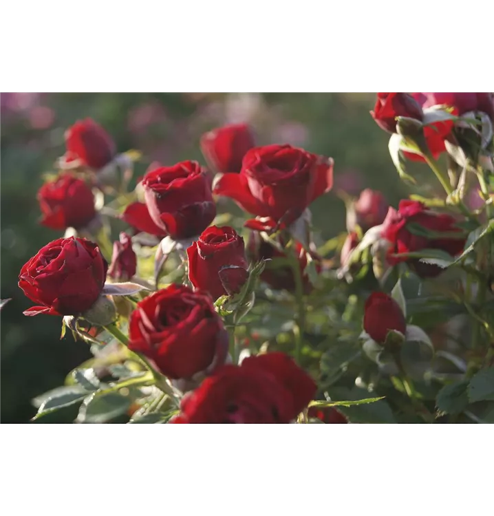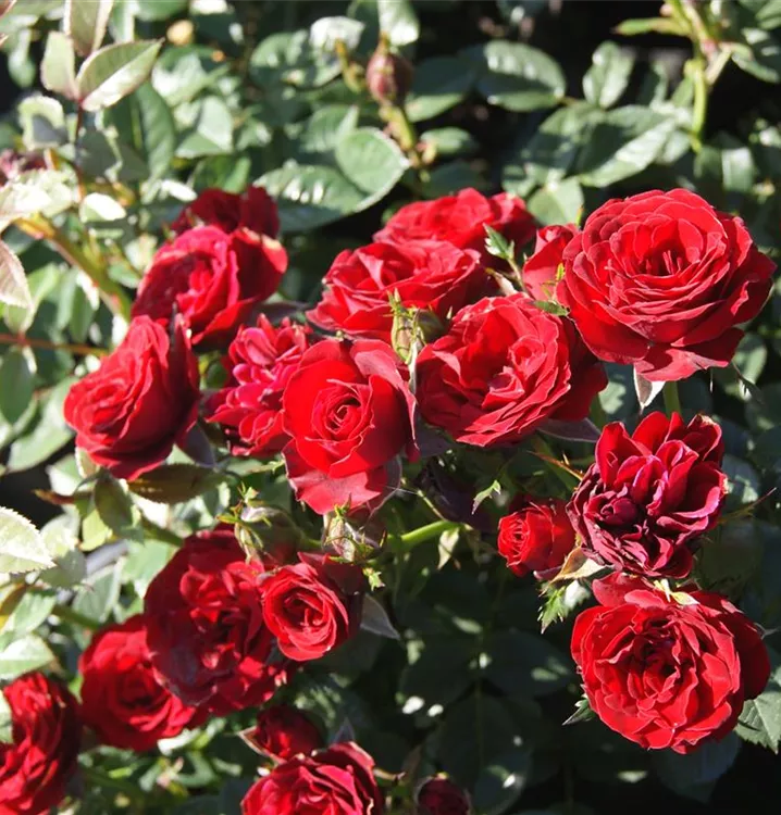 Dunkelrote reichblühende Zwergrose, bestens geeignet für Kübel oder Grabbepflanzung.