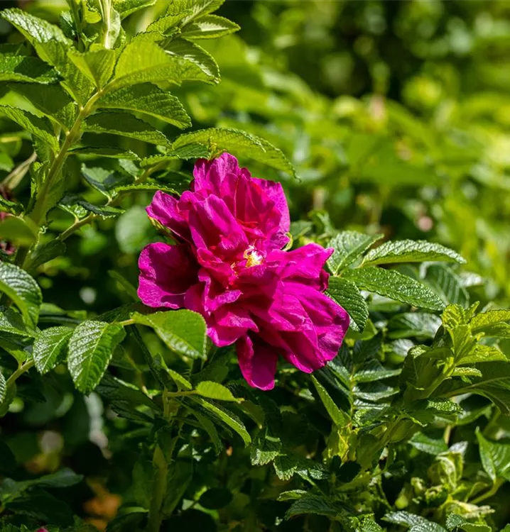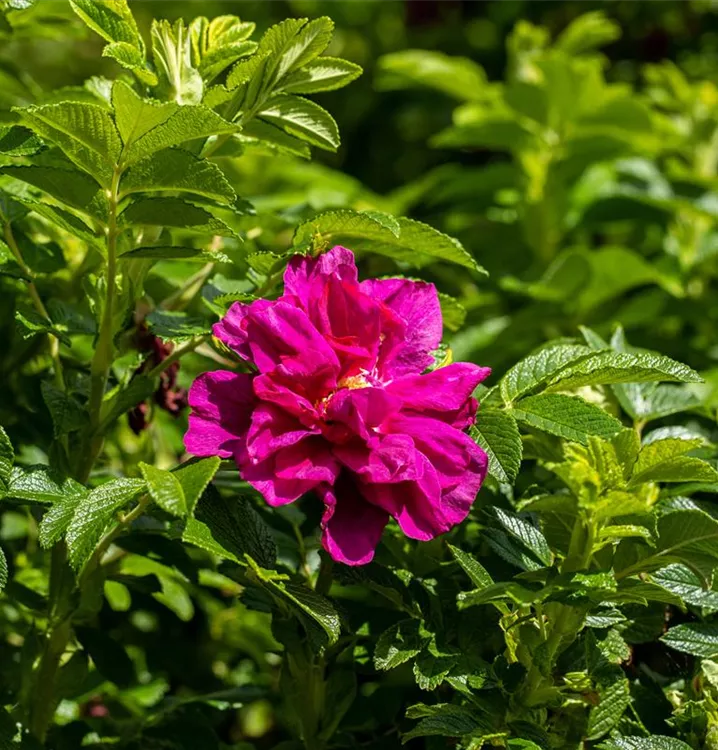 Die Apfelrose 'Roseraie de l´Hay' (Rosa) ist eine reichblühende Rose, die im Garten eine besondere Rolle spielt. Die zahlreichen gefüllten Blüten sind purpurrot und erscheinen von Juni bis Oktober. Ihr wunderbarer Duft entfaltet sich besonders an sonnigen, warmen Tagen. Mit den richtigen Begleitern an ihrer Seite, kommt die Königin der Blumen besonders gut zur Geltung. Niedrige Stauden, Lavendel und Salbei eignen sich ganz gut für diese Zwecke.