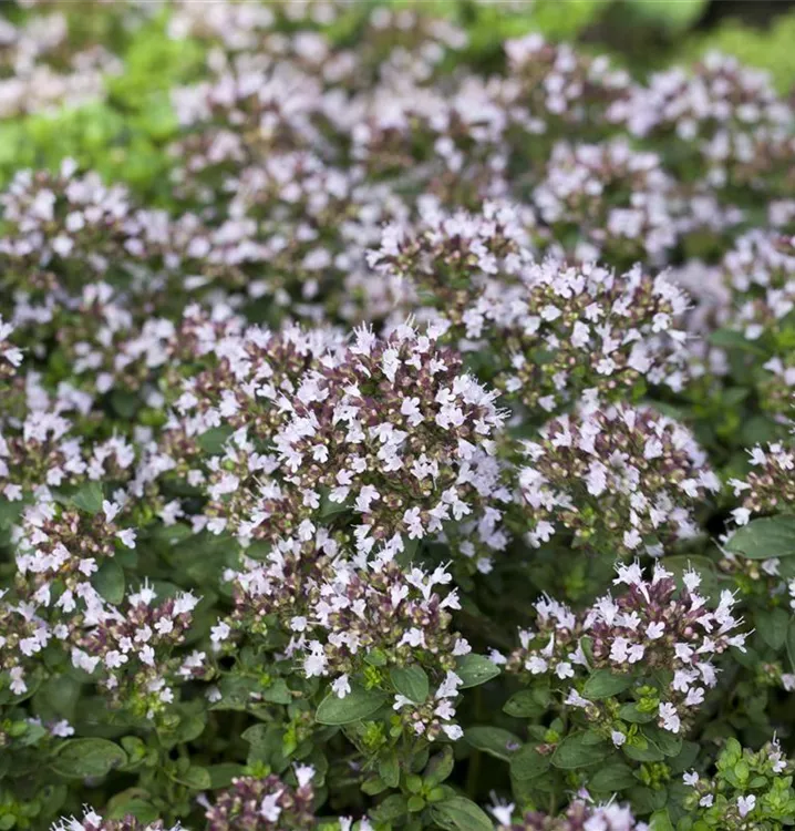 Zum Verzehr geeignet. Origanum vulgare 'Compactum' bildet glockenförmige, in Rispen angeordnete, rosafarbene Blüten ab Juli. Diese verströmen einen angenehmen Duft.