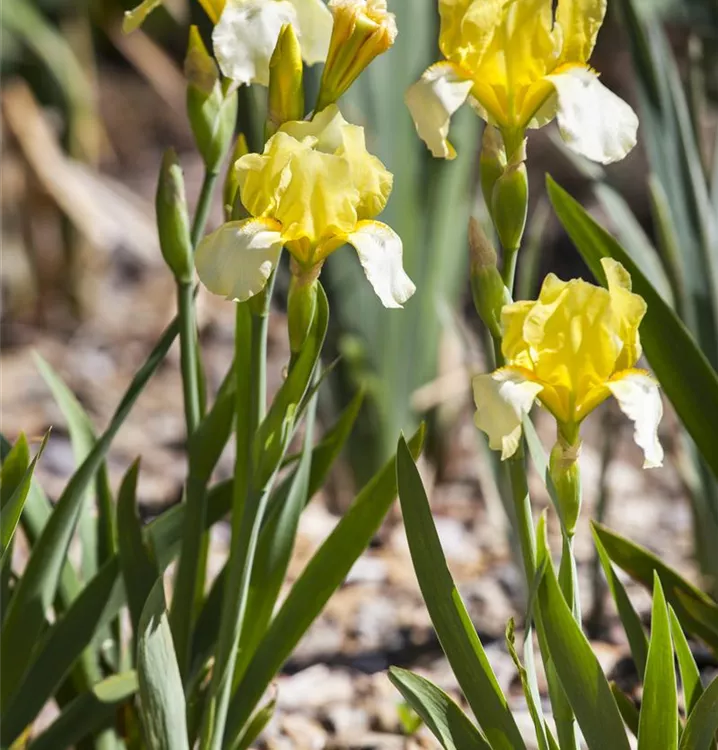 Iris x germanica, gelb bildet lippenförmige, gelbe Blüten ab Mai.