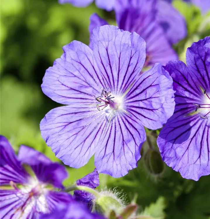Geranium x magnificum 'Rosemoor' bildet schalenförmige, blauviolette Blüten ab Mai.