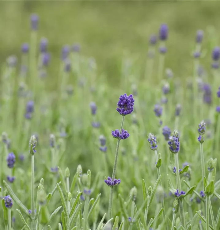 Der Echte Lavendel 'Hidcote' (Lavandula angustifolia) ist eine buschige, kompakte immergrüne Staude, die von Juni bis Juli violette, rachenförmige, in Rispen angeordnete Blüten mit einem angenehmen Duft bildet. An einem sonnigen Standort mit durchlässigem, nährstoffreichem Boden erreicht er gewöhnlich eine Höhe von ca. 40 cm und wird ca. 40 cm breit. Der Echte Lavendel 'Hidcote' ist gut frostverträglich.