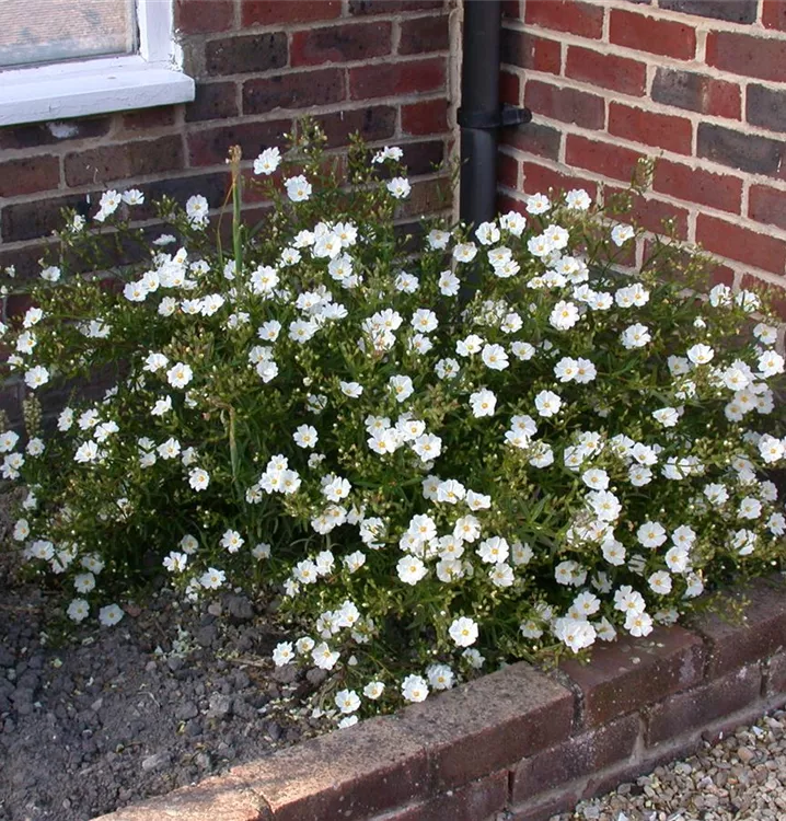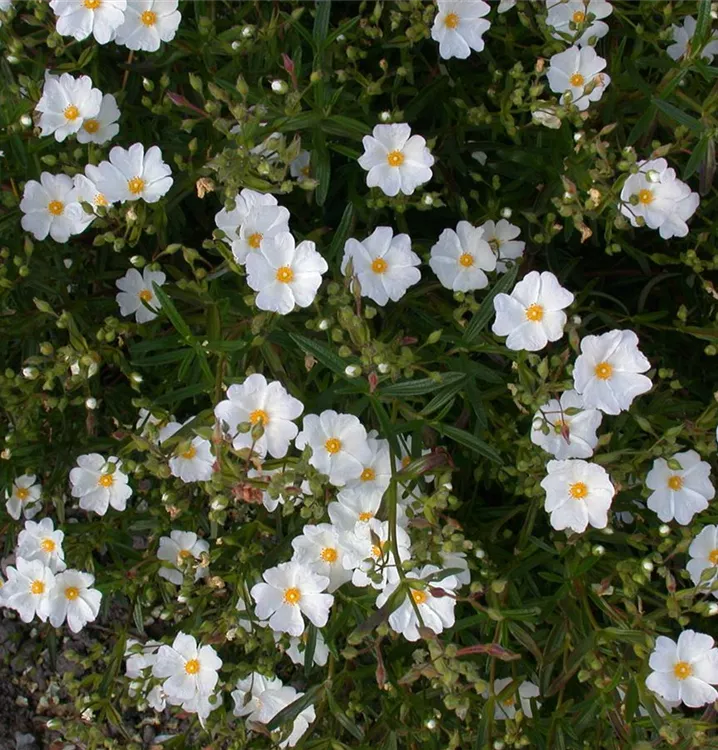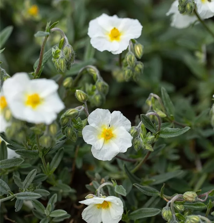 Das Garten-Sonnenröschen 'Eisbär' (Helianthemum) ist eine buschige, lockere immergrüne Staude, die von Mai bis August weiße, schalenförmige Blüten bildet. An einem sonnigen Standort mit durchlässigem, lockerem Boden erreicht es gewöhnlich eine Höhe von ca. 20 cm und wird ca. 25 cm breit. Das Garten-Sonnenröschen 'Eisbär' ist gut frostverträglich.
