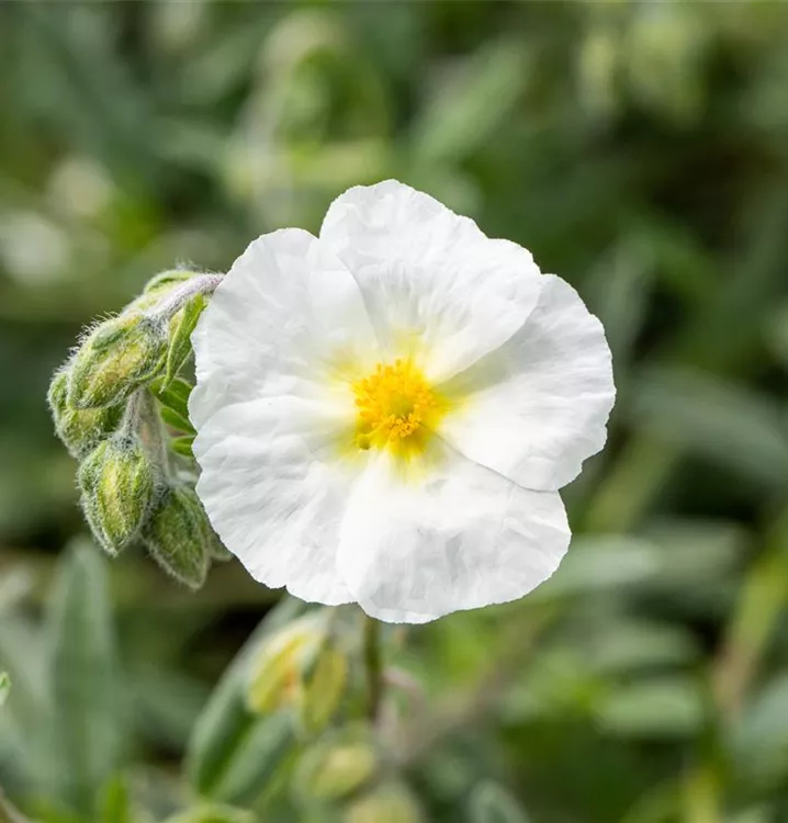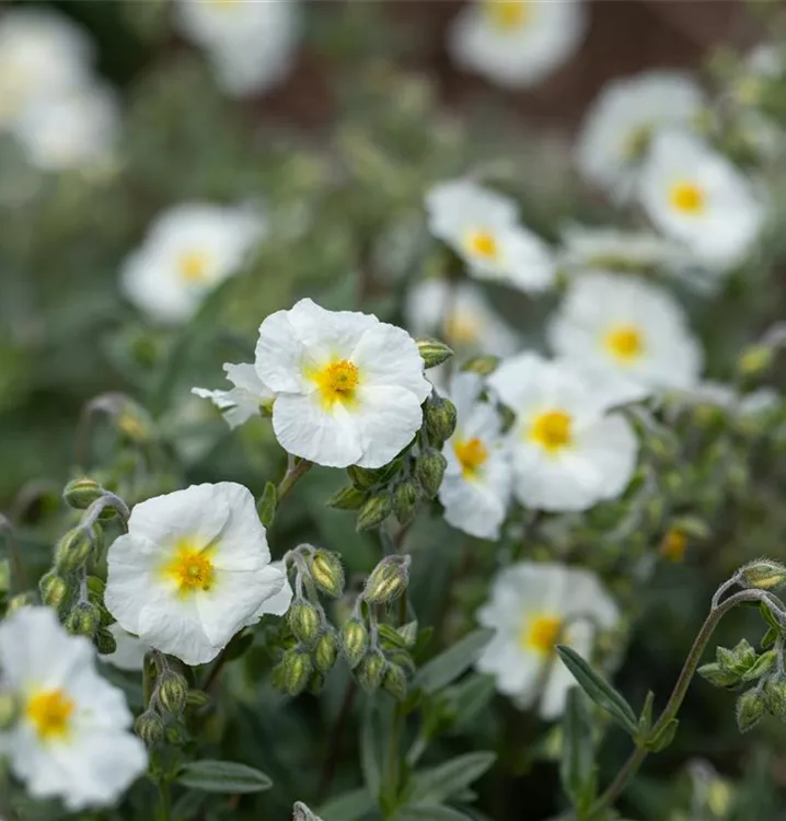 Helianthemum 'Eisbär' bildet schalenförmige, weiße Blüten ab Mai.