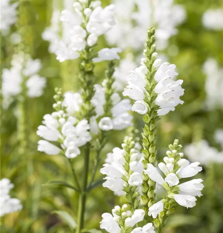Physostegia virginiana 'Schneekrone' bildet lippenförmige, in Ähren angeordnete, weiße Blüten ab Juli.