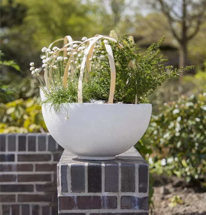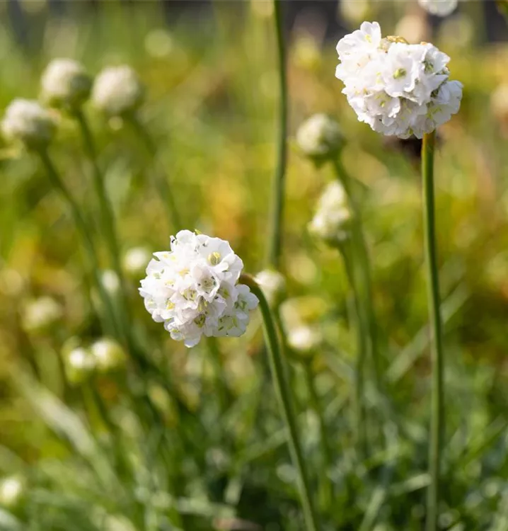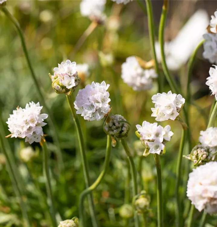 Armeria maritima 'Alba' bildet ballförmige, weiße Blüten ab Mai.