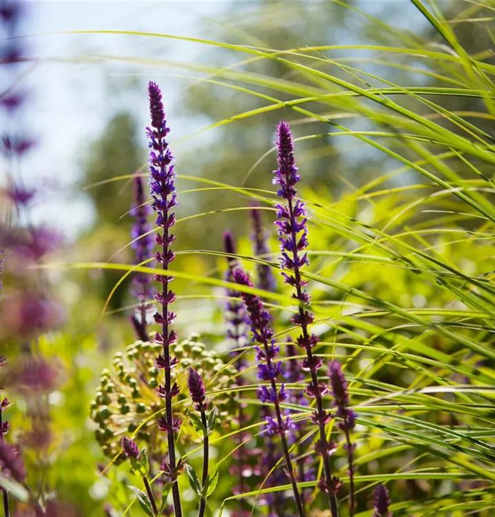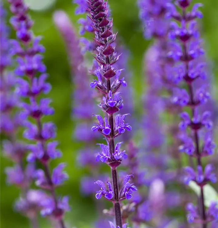 Salvia nemorosa 'Caradonna' bildet lippenförmige, in Rispen angeordnete, violette Blüten ab Juni. Bei richtiger Pflege Nachblüte im September.