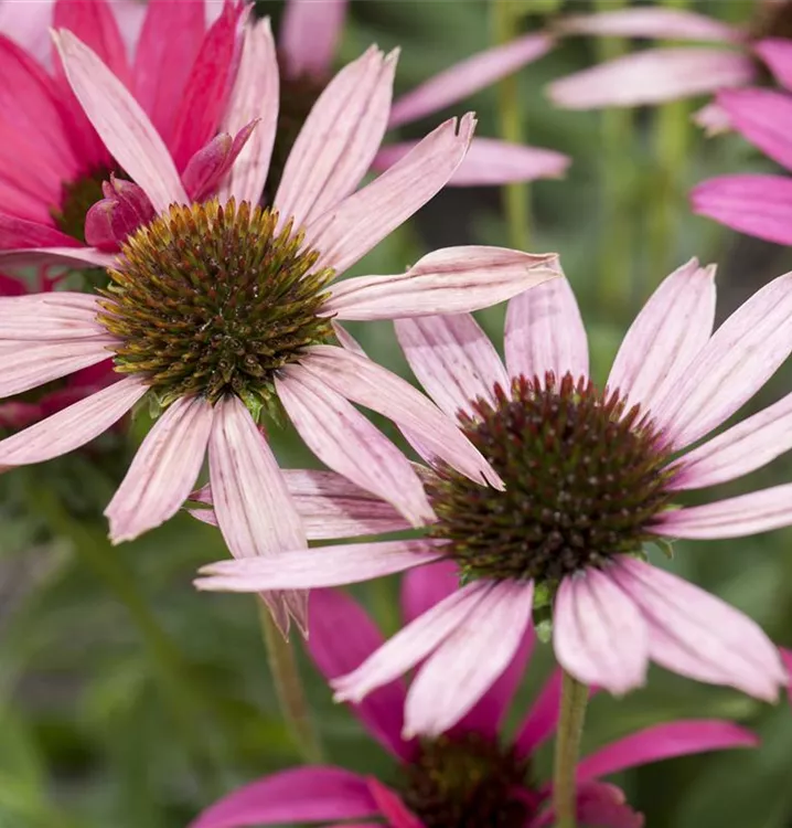 Zum Verzehr geeignet. Echinacea purpurea bildet körbchenartige, rote Blüten ab Juli.