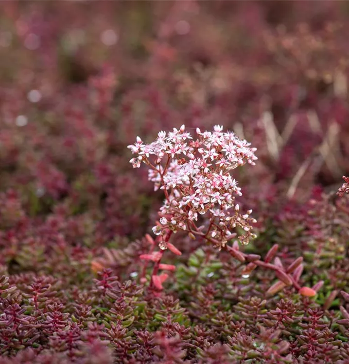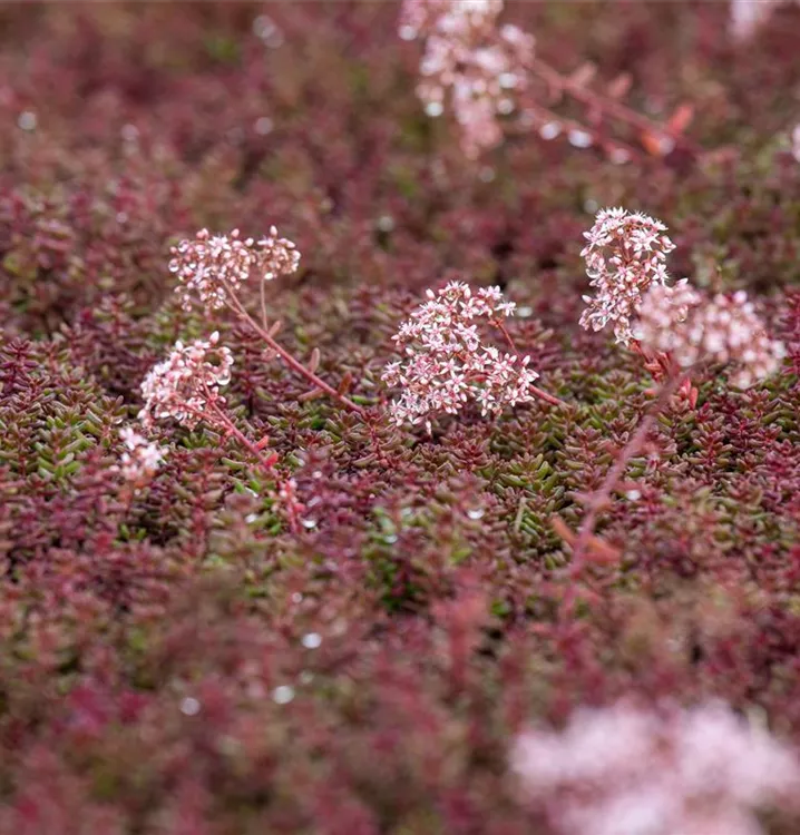 Sedum album 'Murale' bildet in Dolden angeordnete, hellrosafarbene Blüten ab Mai.
