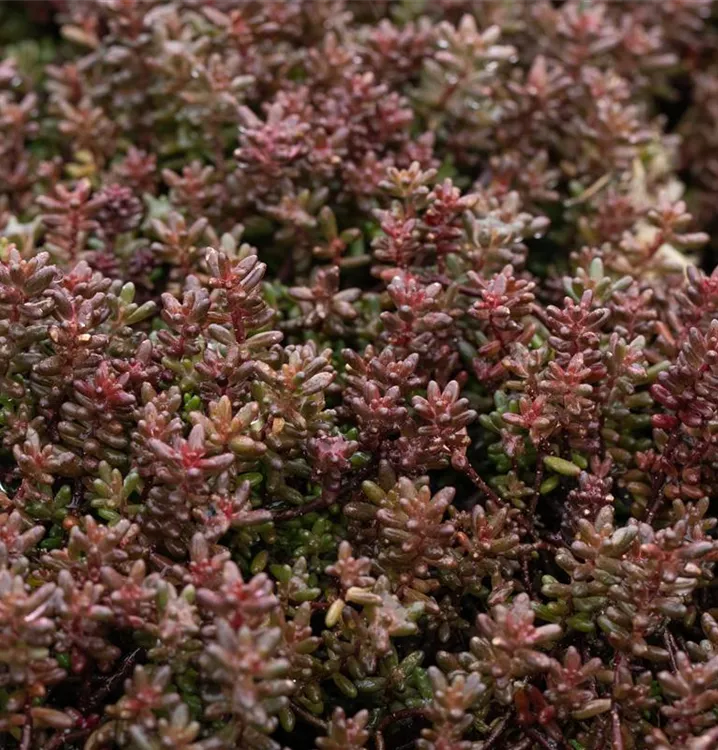 Die immergrünen Blätter des Garten-Rotmoos-Mauerpfeffers 'Murale' sind bronze, dickfleischig.