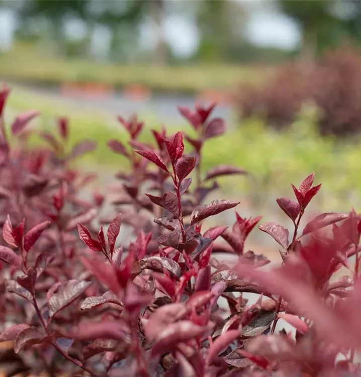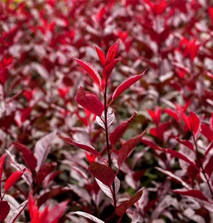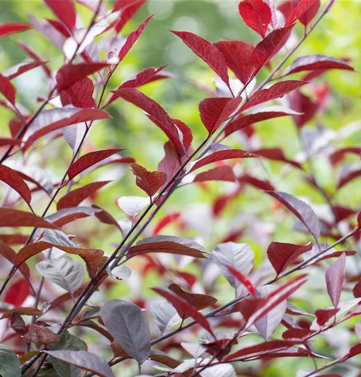 Die Zwerg-Blutpflaume (Prunus cistena) ist ein buschiger, dichter, Strauch mit dekorativen sommergrünen, glänzenden, eiförmigen, dunkelroten Blättern.