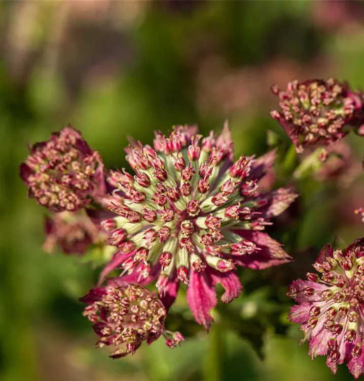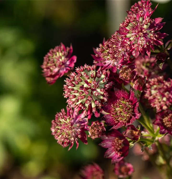 Astrantia major 'Moulin Rouge'® bildet sternförmige, in Dolden angeordnete, rote Blüten ab Juni. Bei richtiger Pflege Nachblüte im September.