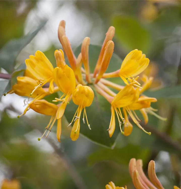 Die Gold-Geißschlinge bildet orangegelbe, duftende Blüten von Mai bis Juli. Die Blüten sind röhrenförmig.