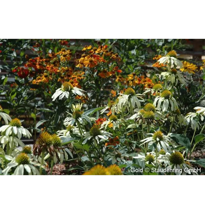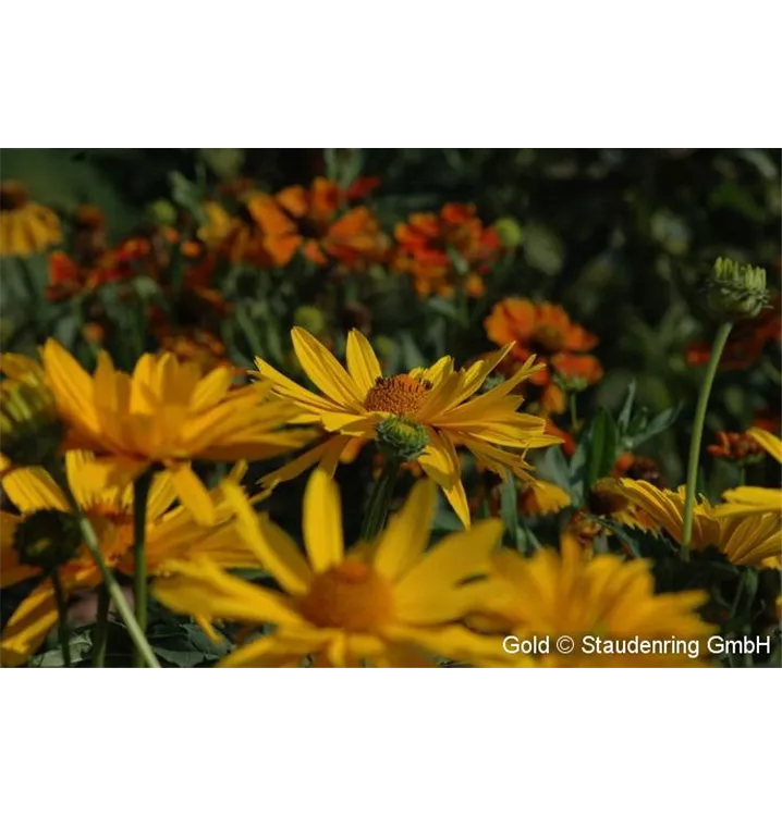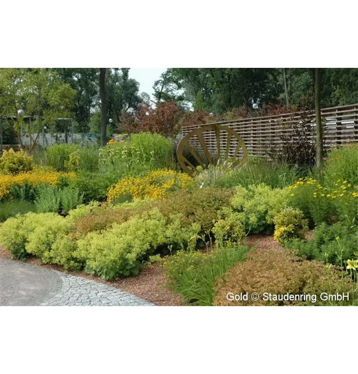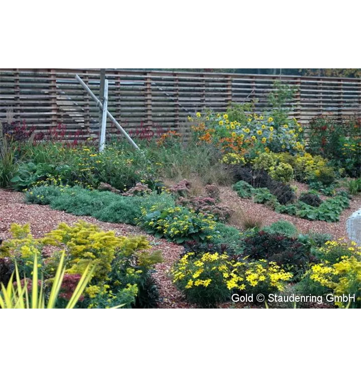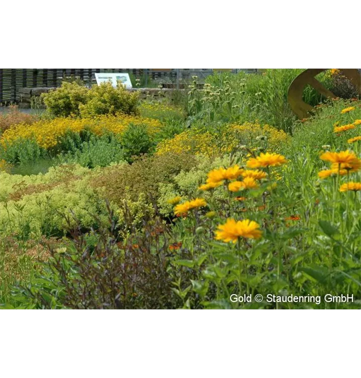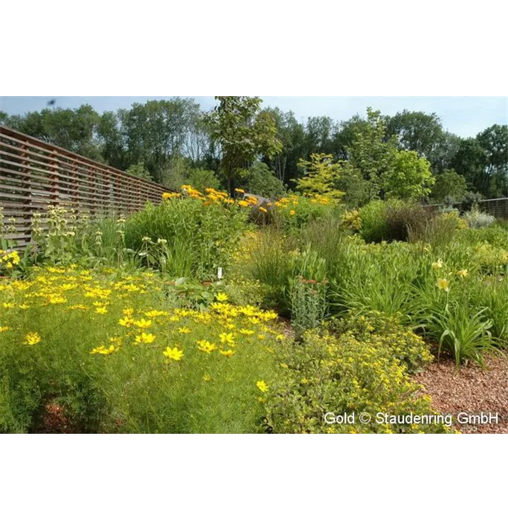 Die überwiegend gelb blühenden Pflanzen verleihen dieser Staudenkomposition einen ganz eigenen Reiz. Die artenreiche Staudenpflanzung ist für trockene Lagen, auch auf schlechten Böden bzw. als Schotterpflanzung geeignet.