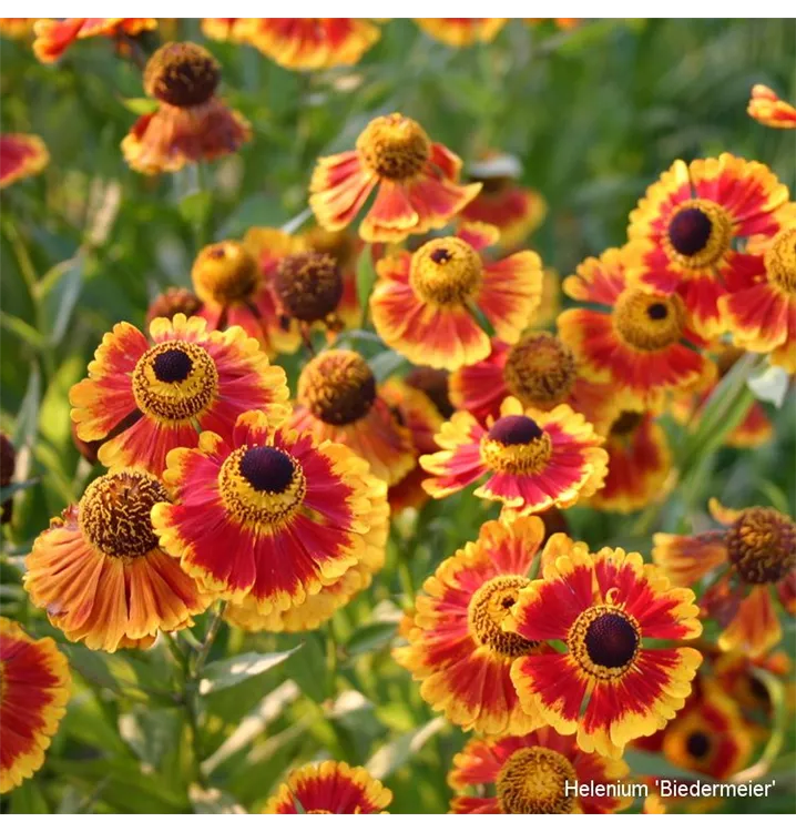 Nostalgische Staudenpflanzung, vielfarbige Blüten für sonnige Lagen, geringer Pflegeaufwand durch sehr robuste Sorten.