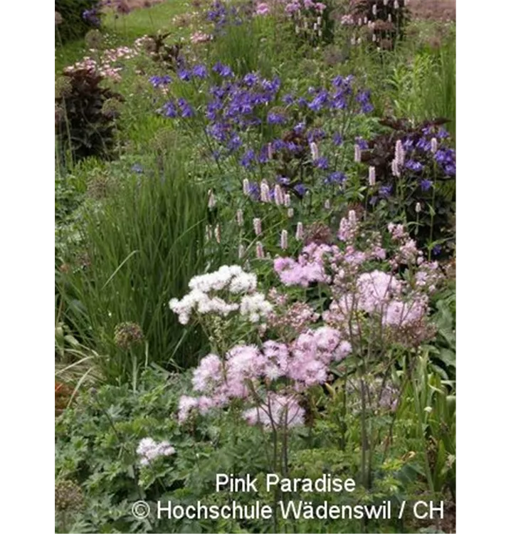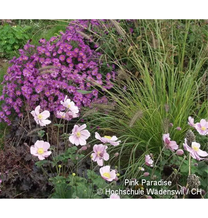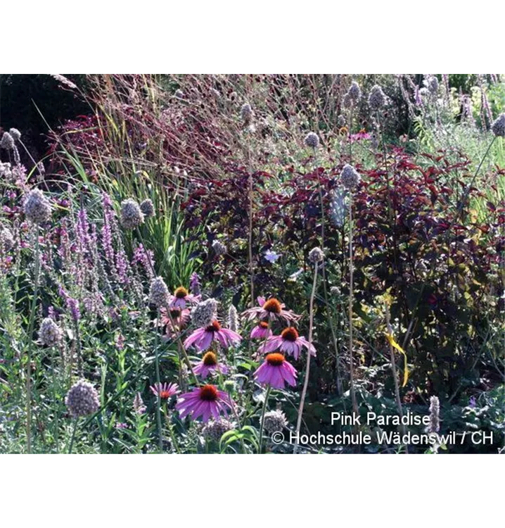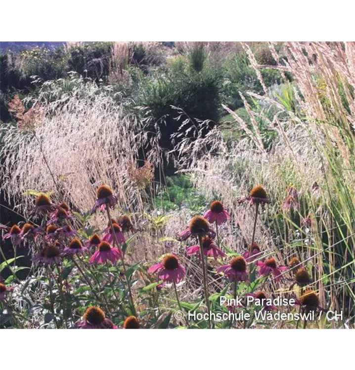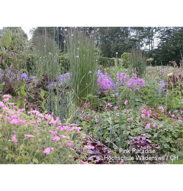 Grazile Pflanzen werden von robusten Bodendeckern begleitet, im Herbst und Winter setzen Gräser kräftige Akzente. Kräftige Farben und der naturnahe Charakter vieler Stauden zeichnen diese Stauden-Komposition aus.