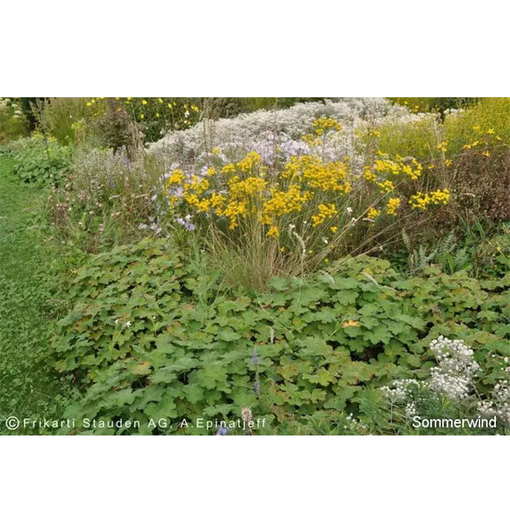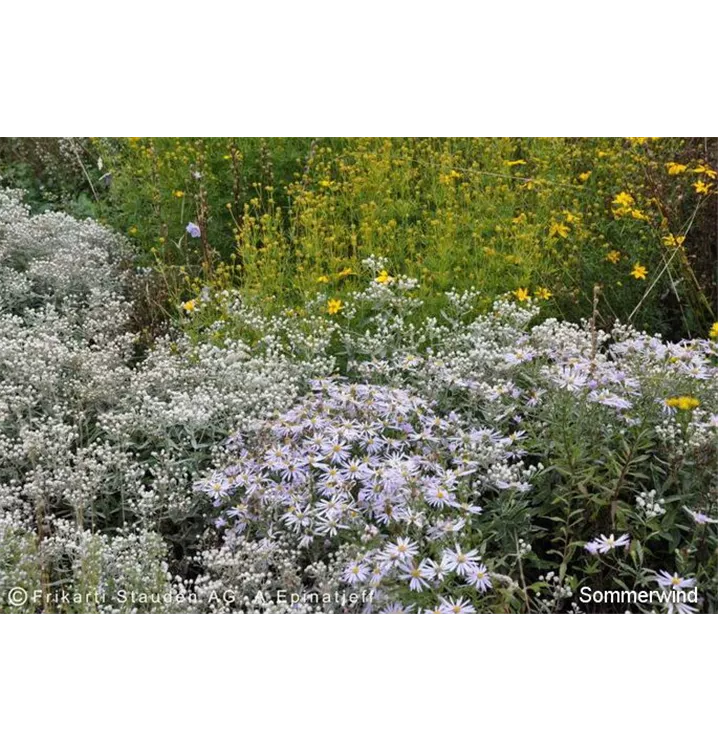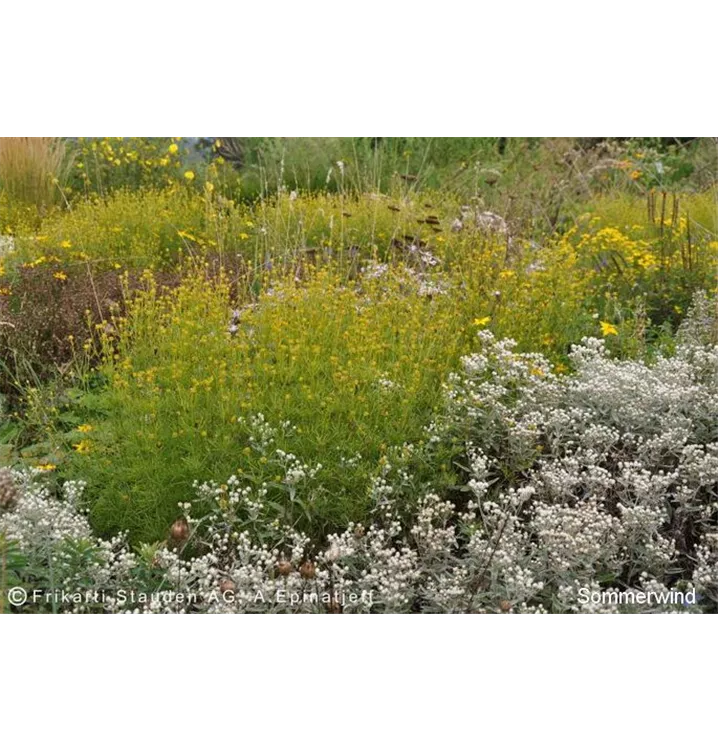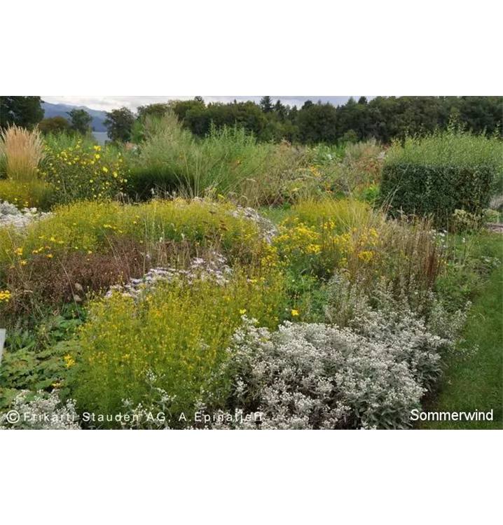 Die Sommerwindmischung ist geprägt durch leuchtende Blüten. Die strukturbildenden Gräser verleihen der Mischung eine besondere Leichtigkeit. Laub und Blüten strahlen eine große Harmonie aus, Bewegung und Zartheit hinterlassen einen bleibenden Eindruck.