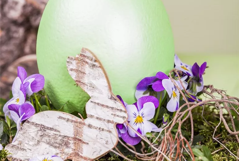 Vögel bereiten ihre Nester für ihren Nachwuchs vor und machen es ihnen besonders bequem. Das passiert jetzt auch mit dem Netz im Osterkranz. Dafür wird das kleine Nest mit Moos ausgekleidet, sodass eine flache Ebene entsteht. Die Eier werden oben so aufgeschlagen, dass die Öffnung groß genug ist, damit die Wurzeln der Pflanzen in die Eierschale passen. Die Eier werden dann ausgespült und bekommen mit Draht und Heißkleber ein Füßchen, mit dem die Eier ganz leicht in das Moos gesteckt werden können. Und dann können die Pflänzchen einziehen.