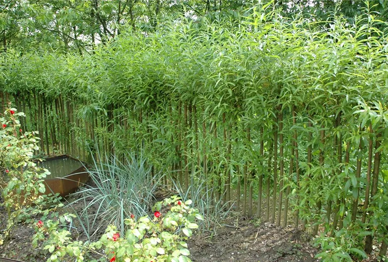 Sofern ein möglichst stabiler Zaun oder auch Sichtschutz aus Weiden errichtet werden soll, werden rund 5 bis 10 cm dicke Weidenäste benötigt. Die Länge der Äste sollte ungefähr 50 bis 70 cm länger als die gewünschte Zaunhöhe sein. Denn zunächst wird ein etwa 20 bis 30 cm tiefer Graben ausgehoben. Dort werden die Weidenäste in einem Abstand von ungefähr einem Meter auf die endgültige Höhe des Zaunes eingeschlagen. Die Einschlagtiefe sollte circa 30 bis 40 cm betragen. Zwischen diese Äste werden im Abstand von 15 bis 30 cm dünnere Ruten über Kreuz gesteckt. Dadurch wird ein besseres Anwachsen gewährleistet. Anschließend den Graben mit Erde füllen und festtreten. Damit bereits am Anfang ein recht dichter Zaun entsteht, können waagrecht lange Ruten zwischen die senkrecht stehenden eingeflochten werden. Auch der Neuaustrieb der Ruten kann laufend miteinander verflochten werden. Wenn die neu ausgebildeten Triebe zu große Ausmaße annehmen, können sie mit einer Heckenschere zurückgeschnitten werden. Um die Bewurzelung, vor allem in der Anwachsphase, sicherzustellen, ist während dieser Zeit und bei anhaltender Trockenheit ausreichendes Gießen erforderlich.