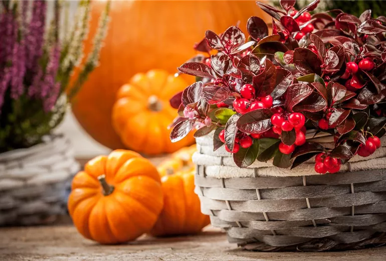 Wenn Sie natürliche Ebenen wie Treppenstufen haben, gibt es viel Platz für die florale Herbstzier. Erika in Tontöpfen, Rosen in Weidenkörben oder Lampionblumen in einem ausgehöhlten Kürbis sind Möglichkeiten für die Begleitung zur Haustür. Ein Regal und alles, was dazu gemacht werden kann, ermöglicht ebenfalls vielfältige Bestückung. Hier etwas Lavendel, da ein Windlicht, dort ein Vogelbeerzweig, dazwischen die letzten blühenden Rosen als Strauß gebunden, und zum Schluss noch ein Ufo in Kürbisform.